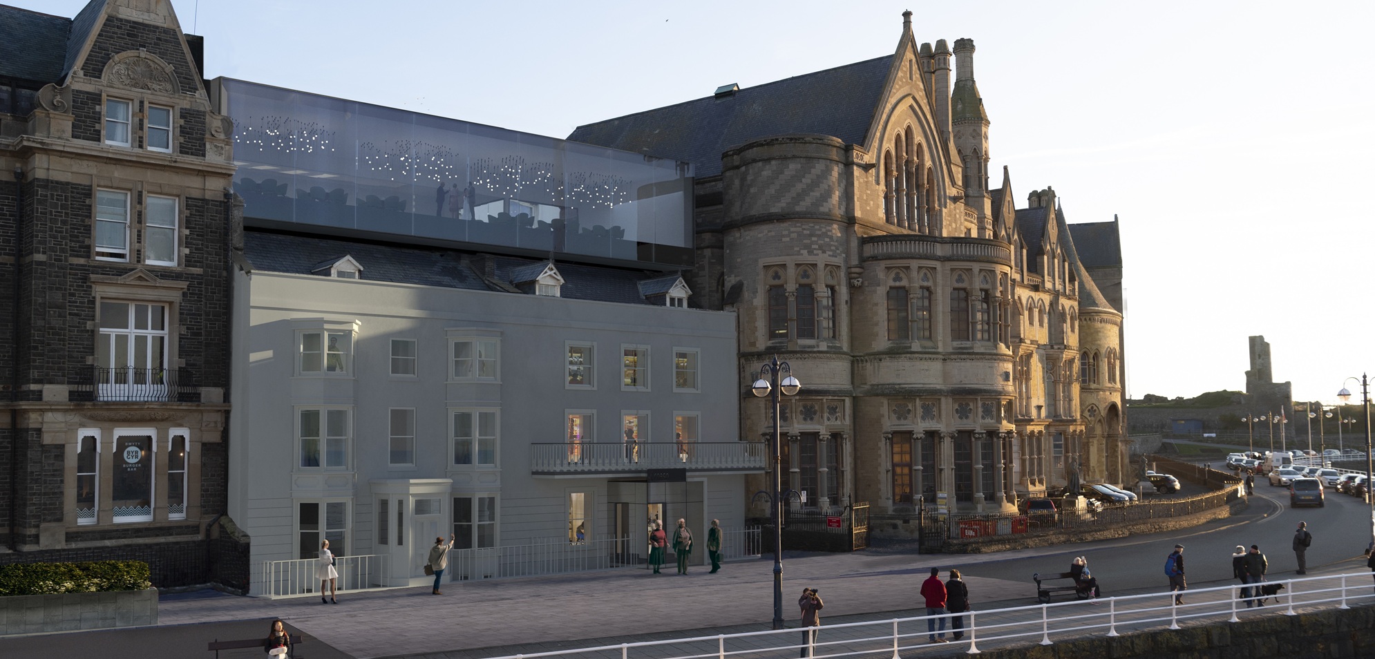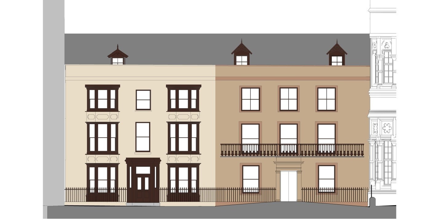 Yr argraff arlunydd â'r ystafell ddigwyddiadau wydr newydd ddramatig yn 'arnofio' uwchlaw’r ddwy fila Sioraidd. Cafodd y lliwiau eu newid ar ôl dadansoddi haenau o baent wrth i’r gwaith adnewyddu fyd rhagddo.