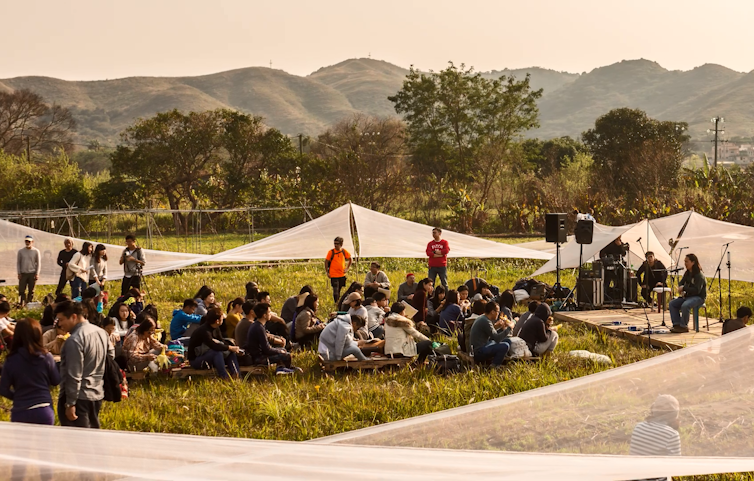 Theatre in the Wild meanwhile is a temporary construction, made out of reclaimed and recyclable materials. The staging area responds to the surrounding environment when the wind moves it and shadows from nearby banana trees play across it. Located in a rural landscape – in the village of Ping Che in the North District – which is threatened by urban development, it is more than simply a place to watch a show. It draws attention to the struggles of local people and creates a space where art and nature are in dialogue – and where residents, invited artists and visitors from the city can meet.