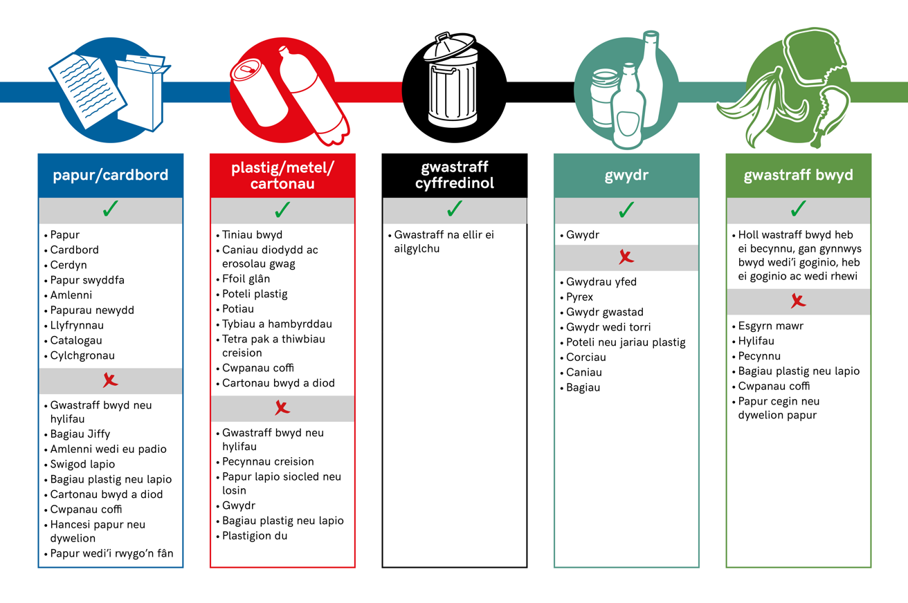 - Dilynwch y canllaw a gwnewch yn siŵr eich bod yn defnyddio'r bin cywir.