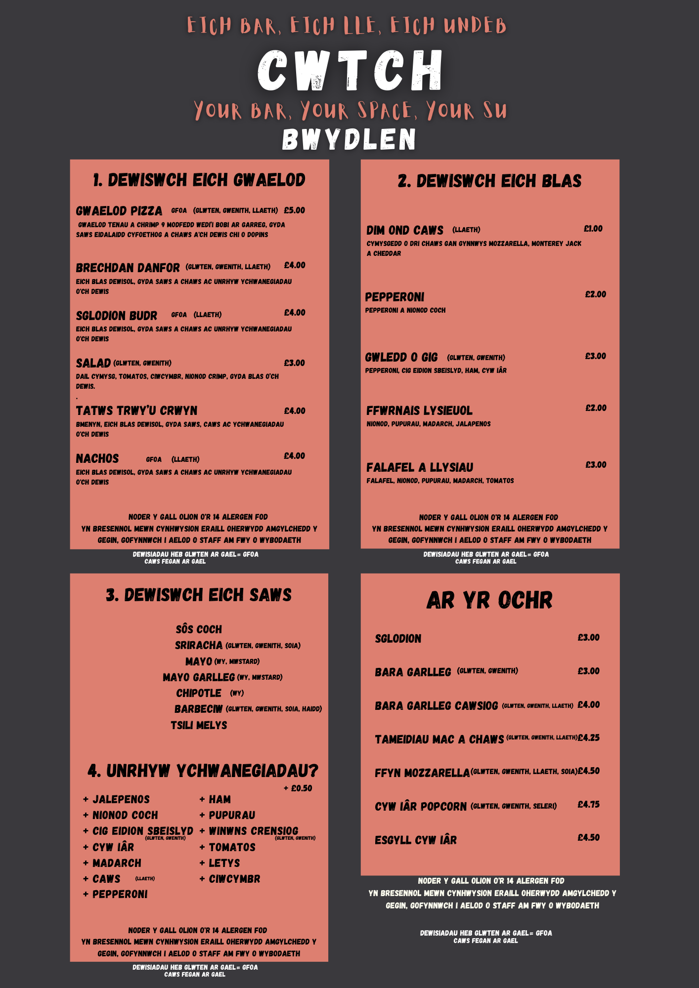 - Cewch fwyta i mewn neu gael bwyd i fynd.