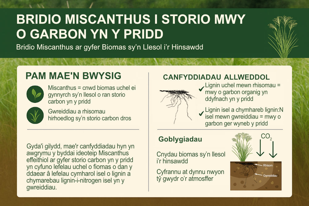 Er hynny, nid yw pob math o Miscanthus yn gwneud yr un cyfraniad at storio carbon yn y pridd â’i gilydd. Mae’n hanfodol deall pa nodweddion mewn planhigion sy'n hybu storio carbon yn sefydlog er mwyn sicrhau’r bod cnydau mor gynhyrchiol â phosib ac i wneud y mwyaf o’u gwasanaethau i ecosystemau.