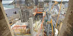 Yn dilyn hynny daw’r gwaith dur a fydd yn lwyfan ar gyfer yr ystafell ddigwyddiadau newydd drawiadol â’i ffenest wydr fawr a golygfeydd godidog dros Fae Ceredigion.