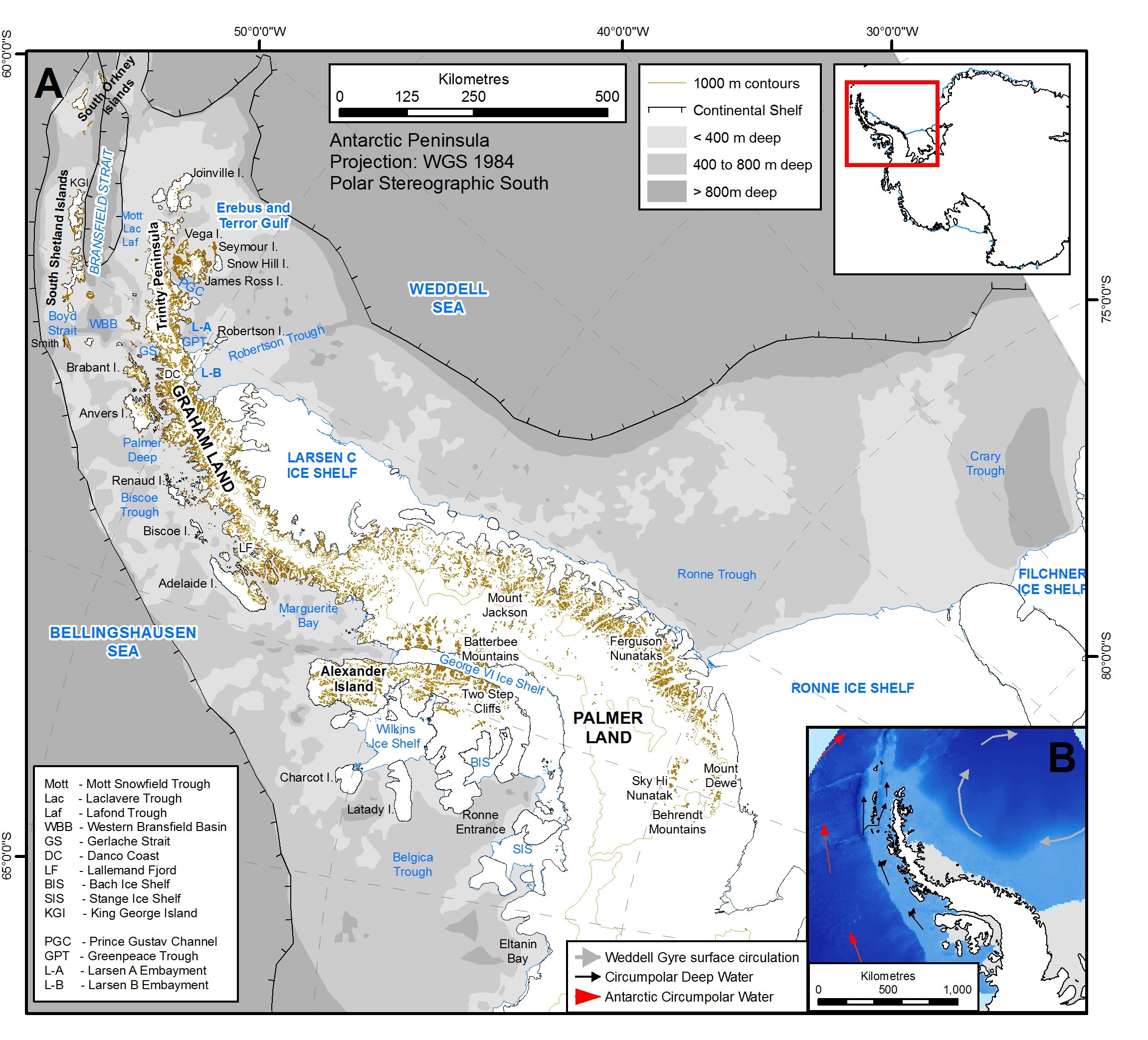 Figure 1. The Antarctic Peninsula. James Ross Island is located on the NE tip of the Peninsula, in a region of rapid warming and numerous glacier changes.