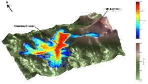 We combine 3-D glaciological modelling using the integrated second-order shallow-ice approximation (iSOSIA; Egholm et al., 2011), remote-sensing observations (e.g. Quincey et al., 2011) and the collection of field data (Figure 3) to quantify how debris-covered glaciers respond to Quaternary and 21st Century climate change. We aim to realistically represent the ice dynamics that govern the mass balance and flow of these glaciers in regions where extreme altitude and steep topography mean that accumulation is dominated by avalanching rather than direct snowfall. Our model simulations (Figure 4) and remote-sensing observations will be validated by detailed field observations from Khumbu Glacier in the Nepalese Himalaya and Glacier Noir and Glacier Blanc in the French Alps. Field seasons are planned for Spring and Autumn 2014 to collect field data describing glacier surface geometries and energy balance, supraglacial debris distributions and proglacial hydrological trends.