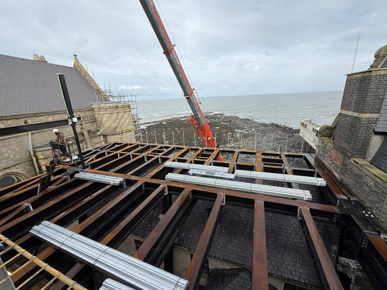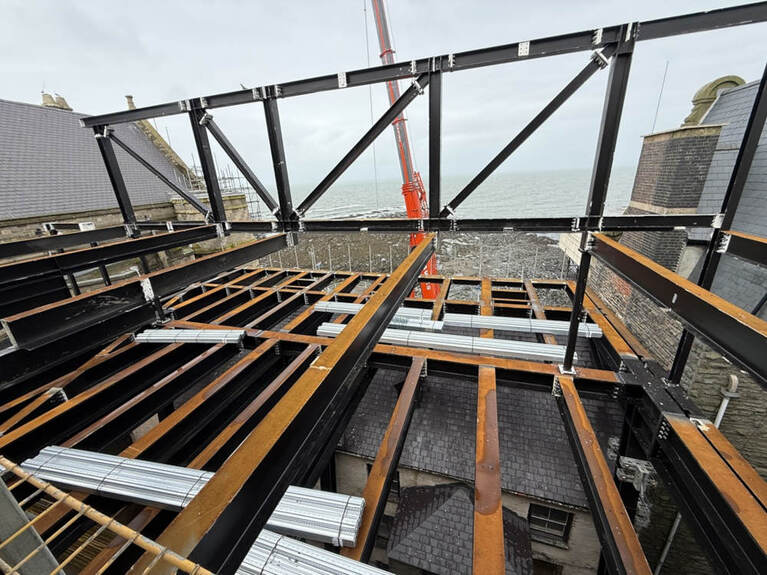 Most of the frame has been assembled in situ, except for the large sea-facing section for the plant room that will provide essential services to the Old College.