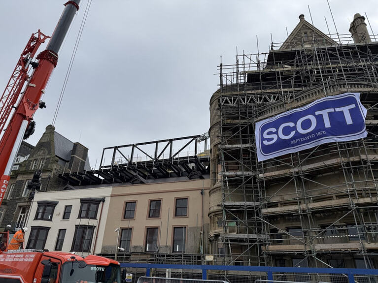 The scaffolding on Old College offers stunning views of Aberystwyth, in this case Laura Place, the old Students’ Union, with Pen Dinas in the distance.