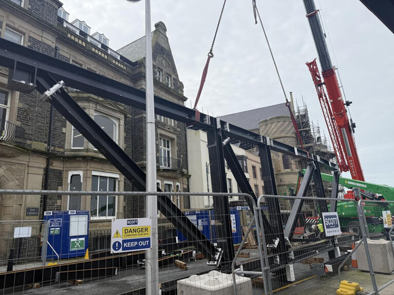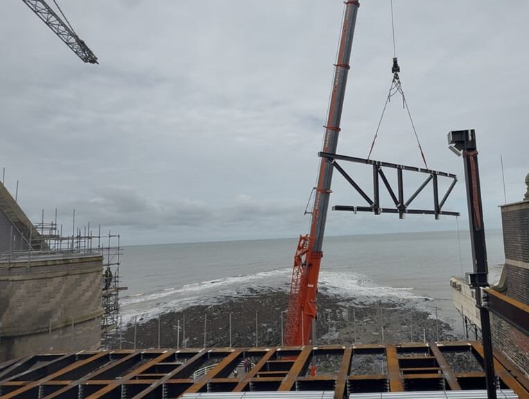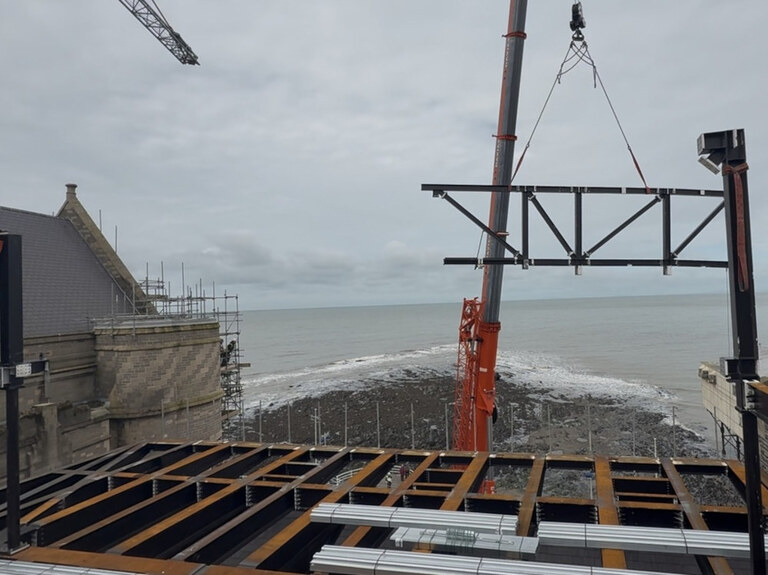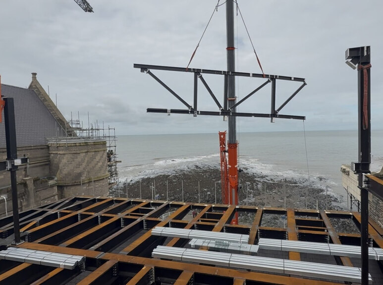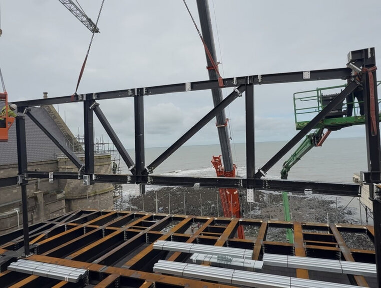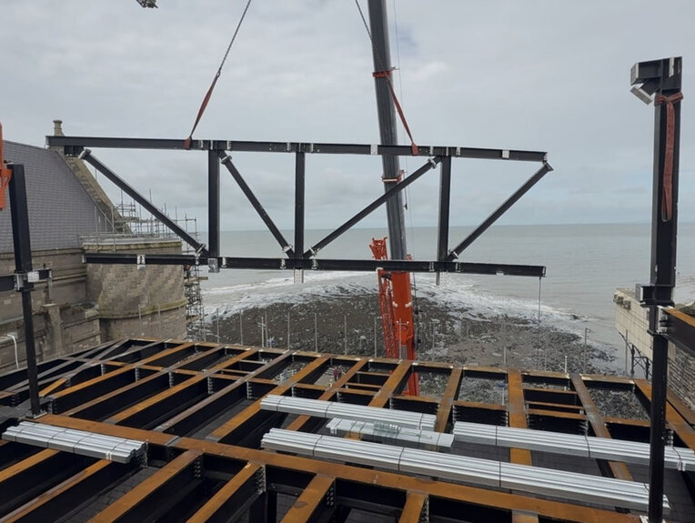 It’s week three of installing the steel frame for the new function room with dramatic views over Cardigan Bay.
